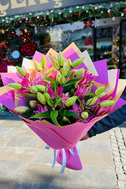 Taze çiçeklerle hazırlanan Canlı Lilyum Buketi, iri çiçek yapısı ve doğal duruşuyla bulunduğu ortama ferahlık ve şıklık katar. Lilyumların zarif formu bukete hacim kazandırır, sade ama etkileyici bir görünüm oluşturur.