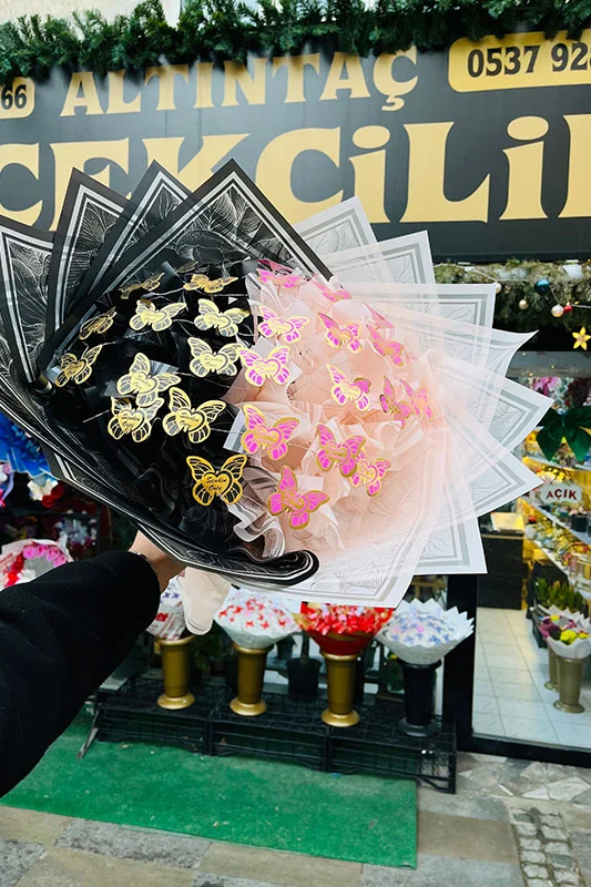 Yapay çiçeklerle hazırlanan bu buket, kelebek detaylarıyla hareketli ve estetik bir görünüm sunar. Dengeli formu sayesinde bütünlüğünü korur, bulunduğu alanda hafif ve şık bir etki oluşturur.